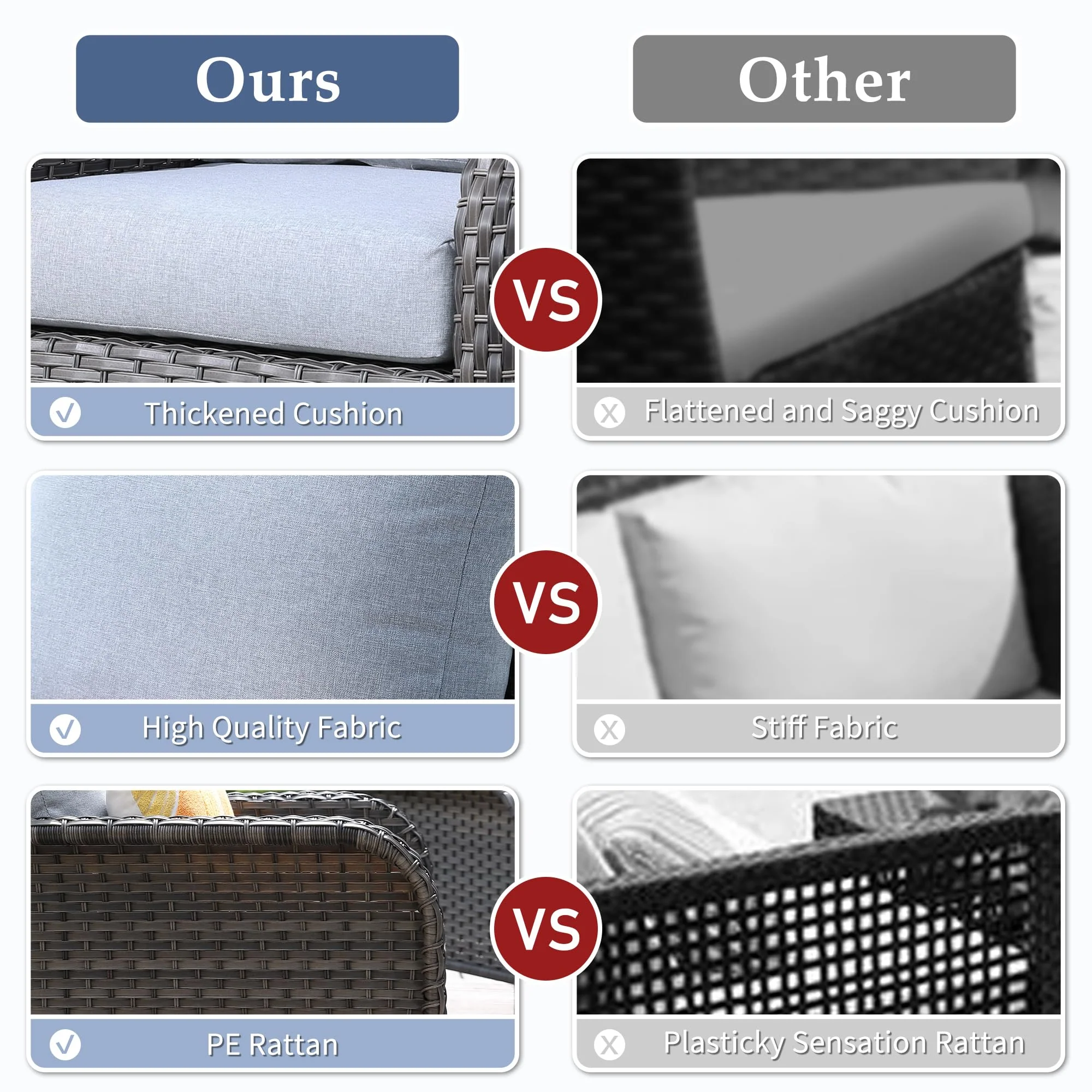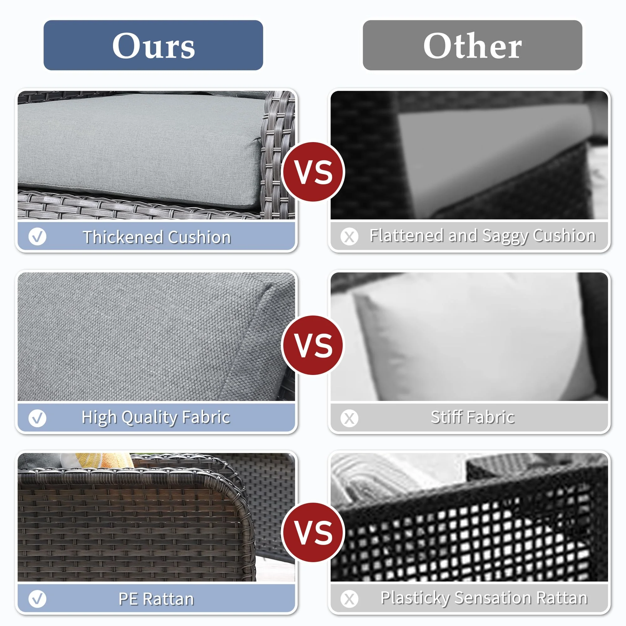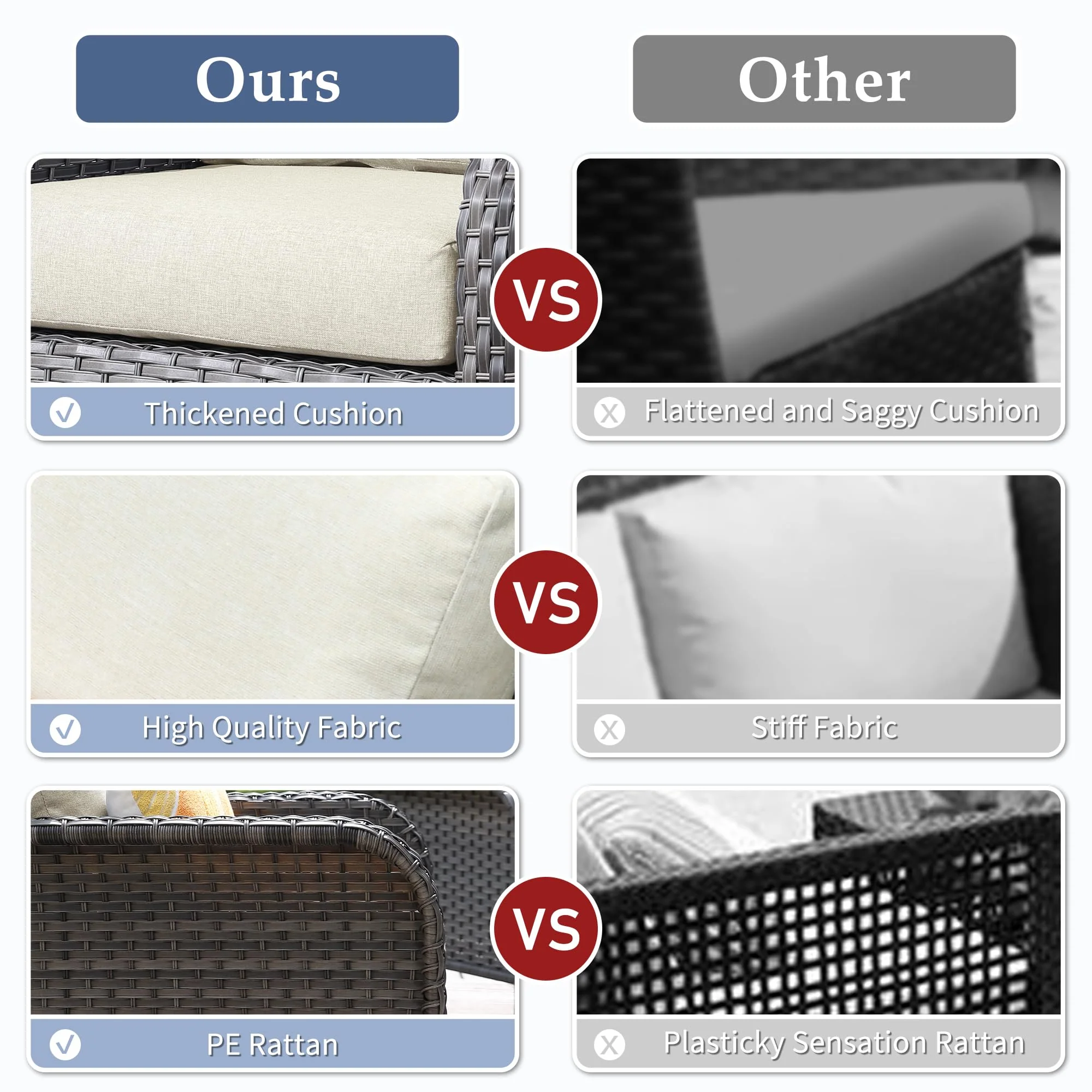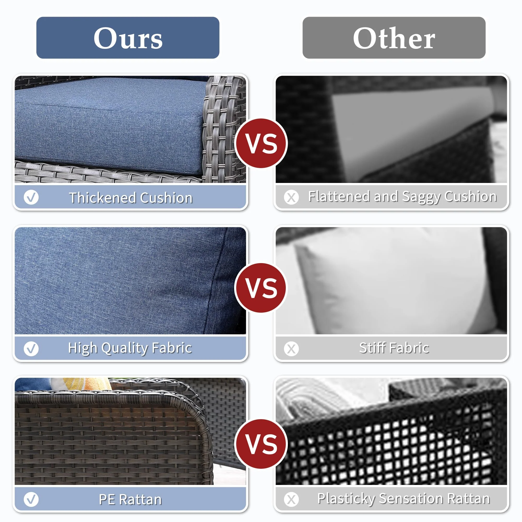 Non-Fading Fabric:3-Year-Non-Fading,made with high-density foam that is soft and supportive, and covered with a breathable fabric that is easy to clean and maintain. The cushion covers are also water resistance, stain-resistant, ensuring they remain in excellent condition in all weather conditions