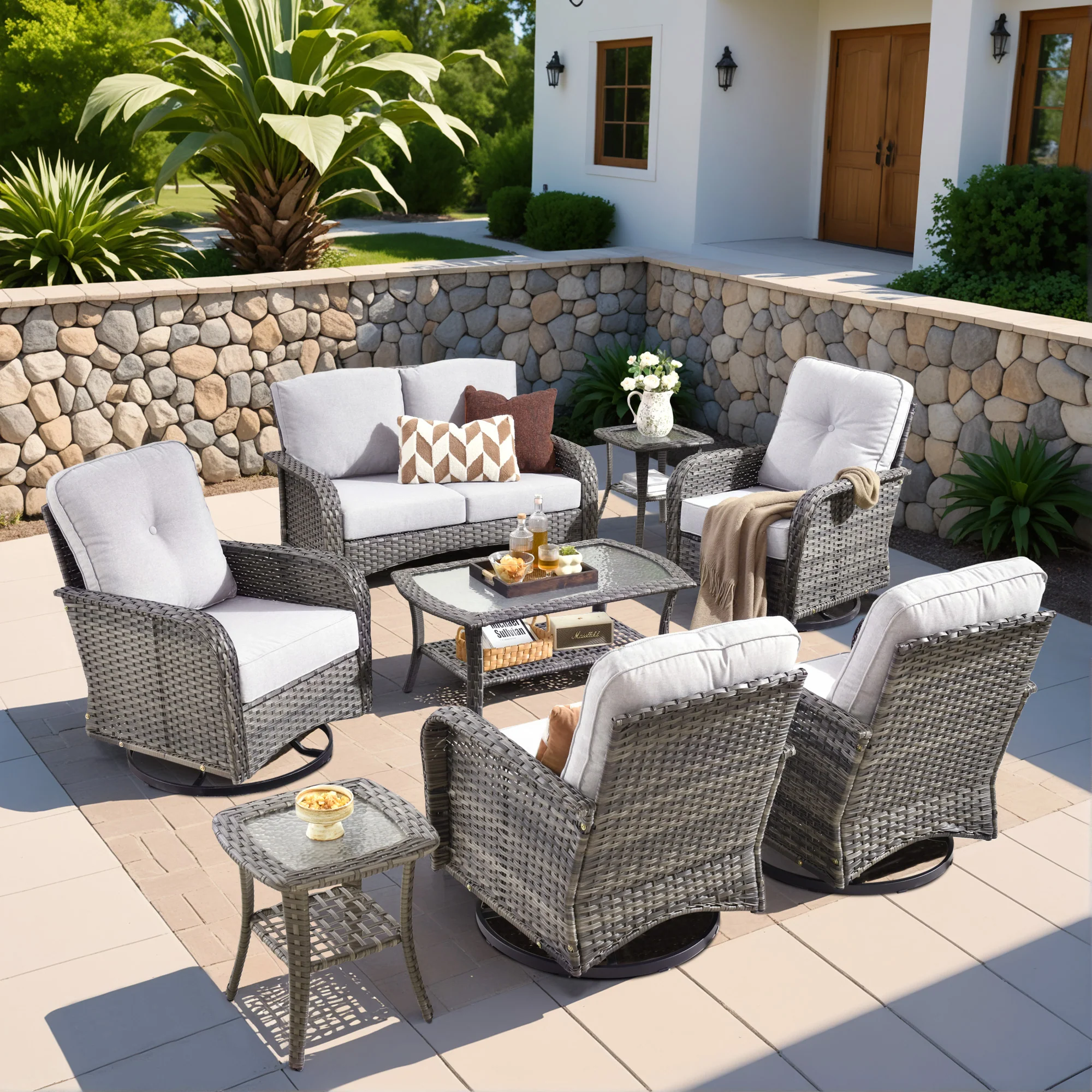 8-Piece Patio Set: Includes 1 loveseat sofa, 1 coffee table, 4 swivel chairs and 2 side tables. The simple and elegant design combines natural wicker colors with modern elements, easily integrating into various outdoor decoration styles, enhancing the overall beauty of the outdoor scenes, make the outdoor terrace more eye-catching