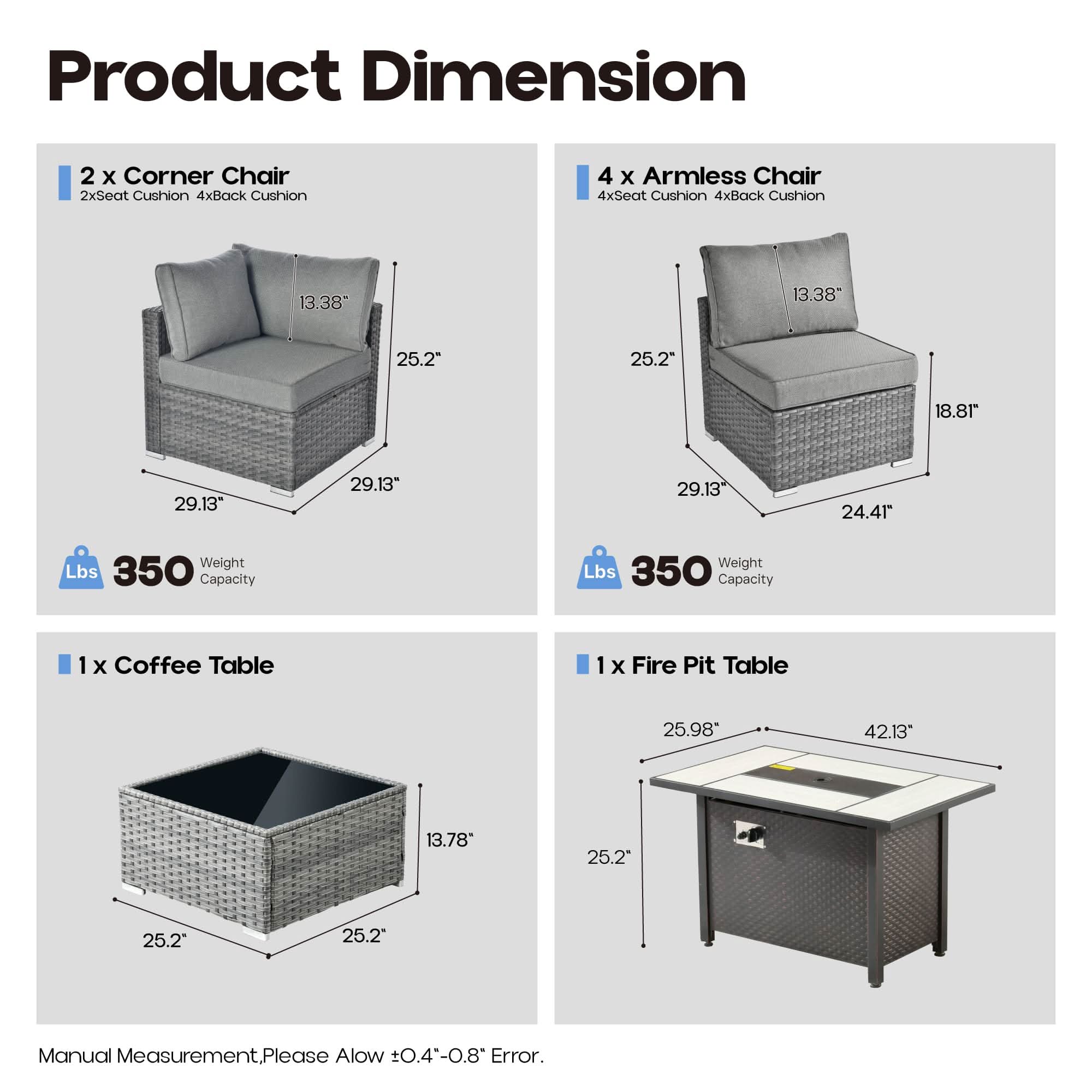 Conversation Set: Package includes 2 corner chair,4 armless chair,1 coffee table,1 propane fire pit table,6 seat cushion,8 back cushion.Versatile outdoor PE wicker sofa, perfect for various settings. Ideal for Outdoor meeting,backyard gatherings, patio lounging, or poolside relaxation. Its low-profile design adds a touch of elegance to any space